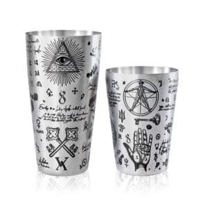 Plongez dans l’univers de la mixologie avec le Shaker Boston Kenko Alchemy, une pièce maîtresse pour professionnels et passionnés. Son design intrigant, rehaussé par des gravures ésotériques et alchimiques faites à la main, transforme chaque préparation en un rituel. Fabriqué en acier inoxydable 18/10 avec une élégante finition satinée plaquée argent, il offre une capacité généreuse de 828 ml.